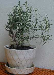 Rosemary is an excellent plant to use for bonsai. It roots easily, in either water or in dirt( using a hormone, such as rootone). Thicker branches from older rosemary plants already have little root nodules just waiting for water to burst forth. Rosemary takes to pruning gracefully, and puts out a thick growth where it has been cut. It can be formed and shaped with wires. |
