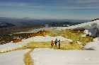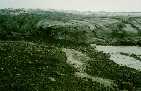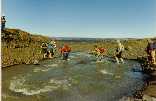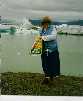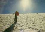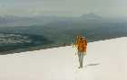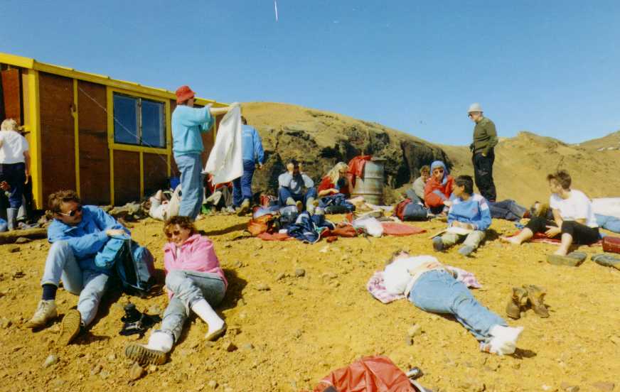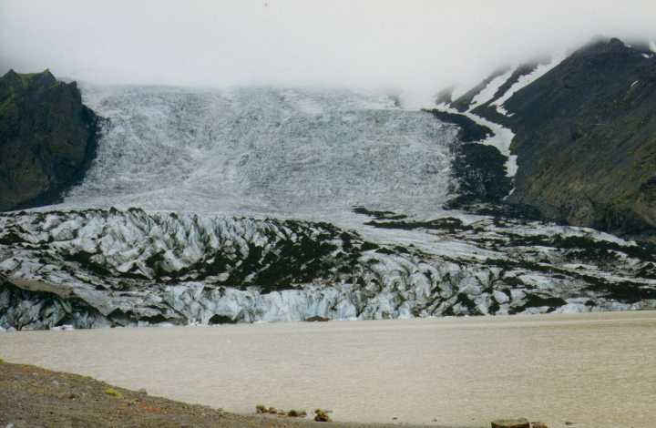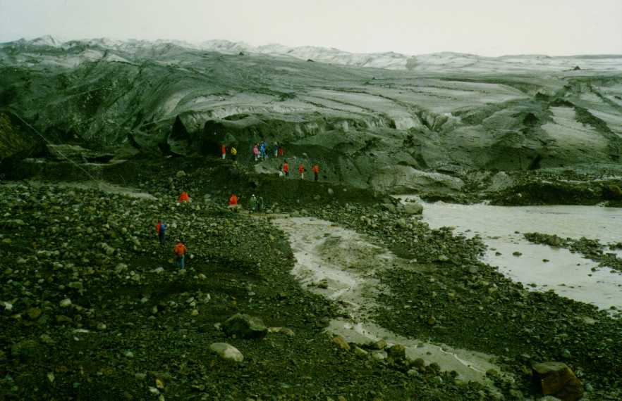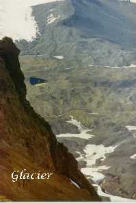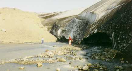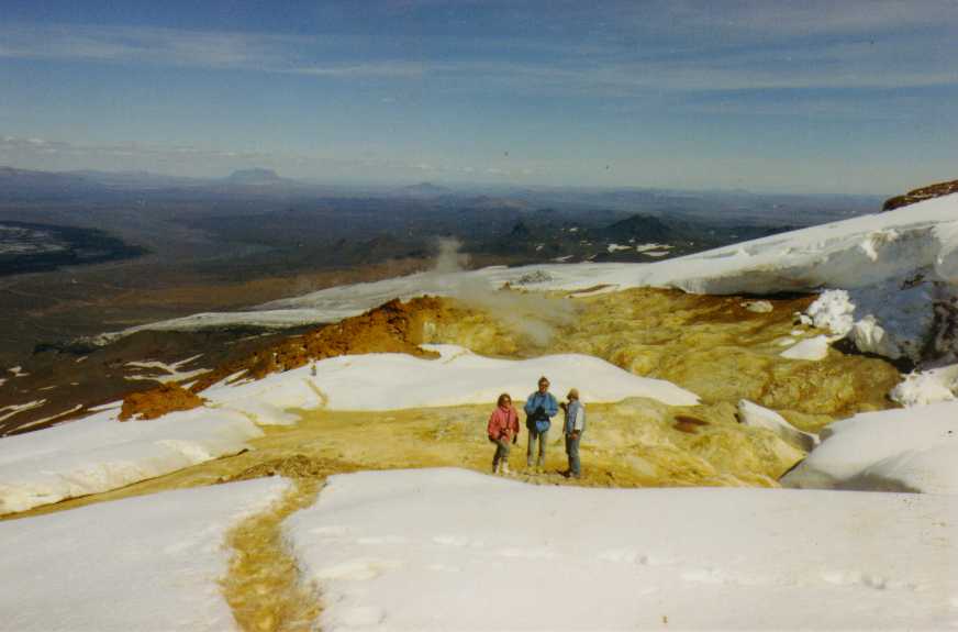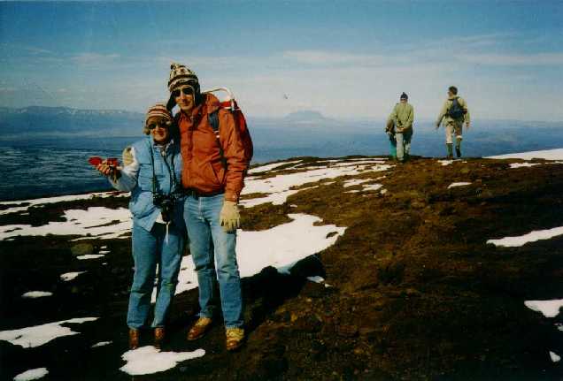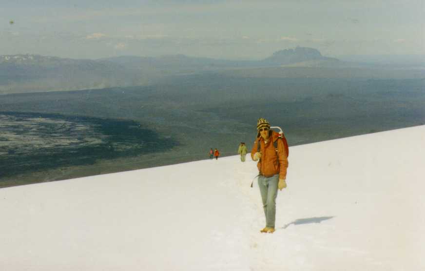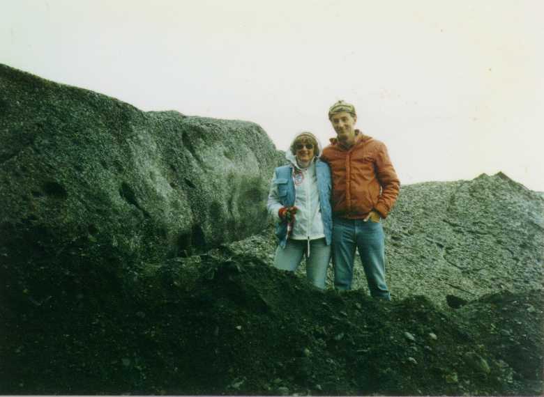 Vatnajokull, on the southeastern slopes of Iceland, is the largest glacier in Europe. Our tour took us around the glacier; we camped at its foot and walked close enough to touch it; we traveled to the high desert, and camped just behind its head. That was a stark and desolate campsite: sod "rugs" had been brought in to pitch our tents on, otherwise the ground would have been too uncomfortable for sleeping. There was a very small airstrip there, we strolled up to it and looked back, up to the peaks looming above us. Someone pointed to the snow cap, with steam rising from it. "Bet that's where we will hike tomorrow". The rest of us were incredulous, unbelieving. It seemed almost -- out of sight! But in the morning, after eating a hearty breakfast and tearing down the tents, Sigrun gathered us all together. "Are you ready for a little walk?" she asked. Several of us suggested we'd wait back here, and were told that was impossible, we'd be meeting the bus on the other side. And so we trekked up the mountain, Tippi bringing up the rear. Her boots were the products of Banana Republic; darling boots but not at all waterproof. Her feet were wet and cold, she was wet and cold and miserable. "Never again" she was heard to mutter. We hiked passed the steam vents, reminders that this glacier was sitting on top of a live volcano, to the top of the glacier where a hut had been built. It was a resting spot. The others had finished their rest when Tippi and Larry finally arrived. Again we brought up the rear. The rest of the tour group were always out of sight, but we had their tracks to follow. At the bottom of the snow field, luckily, some friends had waited to guide us to the bus.