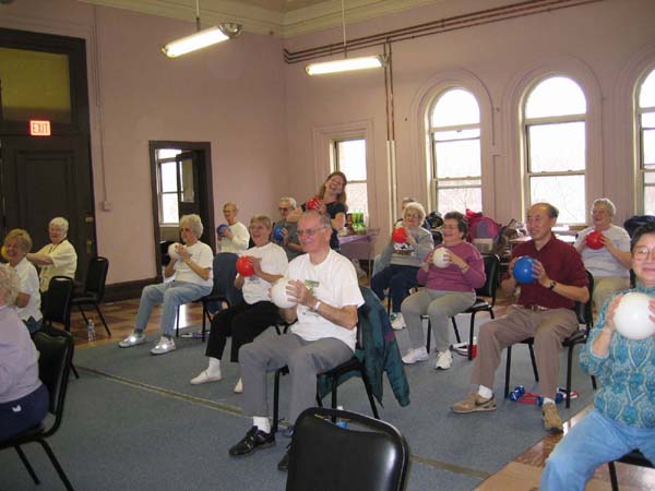 Silver SneakersI was raised on the food TRIANGLE - those major food groups, MEAT, VEGETABLE, STARCH. It's a habit hard to break. But now, the latest food pyramid has been published and it's strict! Over half our daily intake is to be vegetables & fruit. Red meat is out. Fish and fowl are OK, dairy should be skim. And the base of this new pyramid is not a food group -- it's exercise! 45 minutes a day! We don't do badly on our exercise base -- we have our mall walking and our swimming and here, pictured, our Silver Sneakers -- exercise class for us seniors, keeping each part of the body stretched and nimble and not under too much pressure. We use balls and weights (small ones) stretchy bands and our instructor makes it fun.
