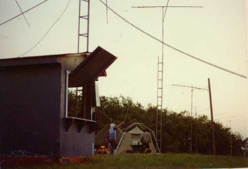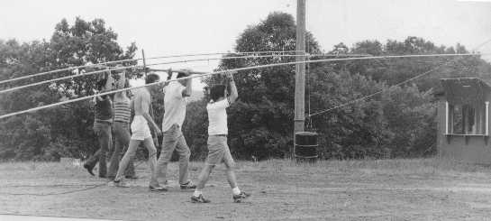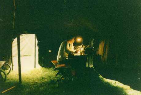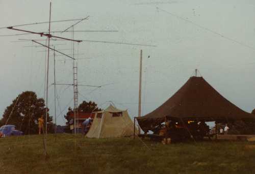 The idea is to go out into a field somewhere, away from one's usual operating environment, and to operate under emergency power. And out in that field, under sometimes trying conditions, try to contact as many other groups or individuals operating under similar circumstances as possible. A point for each contact. Multipliers for the degree of emergency power and circumstance. Extra points for sending certain specified emergency messages. ![]() The club members arrive at the site early on Saturday morning. There are tents to be erected, antennas to be unpacked, assembled and raised, the power source (generator or batteries) set up, equipment brought into the tents and tested. All this work is scheduled and organized months beforehand. This is the big contest of the year, in fact, for some clubs, the only contest. For many years, the Field Day site for the South Hills Brass Pounders and Modulators was a hill top in South Park, across from the model airplane field. The club - of Whitehall PA but drawing its members from all over the South Hills - owned a big surplus army tent, a number of towers and beams which were packed during most of the year in long, thin crates dubbed "anaconda coffins" and, the pride and desperation of the club, a huge, trailer housed gas powered generator. Many years ago, two telephone poles had been erected at the site, spaced exactly right for an 80 meter dipole; two others were spaced for 40 meters. South Park also provided several small sheds which were used for the contest. Members provided additional tents. When it was all set up, it resembled an army installation, with the generator in the center, and the cook tent also very prominent. ![]() The members provided the transmitters and receivers, mikes and keys, and tables to put them on and chairs for the operators. Desk lamps for night time operation. Each band had its own tent or shack, and operator/logger teams assigned to each time slot. All very serious business! The contest runs for a 24 hour period, from 2 pm on Saturday to 5 pm on Sunday . This gives a little leeway to the club that may have problems in setting up; they start later but can operate until later on Sunday. |