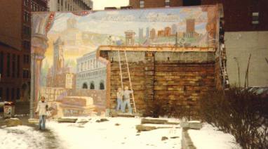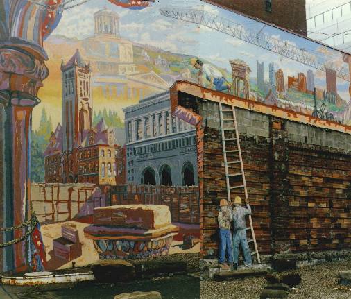 The mural was painted by Pittsburgh artist Robert Qualters with the help of some of his students, on a commission by the President of Oxford Development Corp. and was called (while it lasted) "Pillars of Pittsburgh - For Thomas Cole".