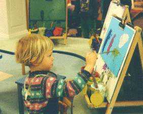 Now we go to the art room.Nancy paints a beautiful picture.
