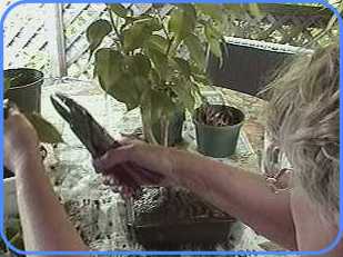 Because the roots are so shallow, it is very important to keep bonsai well watered. I soak each one in the sink once a week and drain it well before returning to it's place on the shelf. The bonsai have a shelf in the greenhouse for the winter, and in a shaded corner of the porch for the warm weather. I rotate them to the dining room table, which is under a skylight. They are pleasant friends to share a solitary lunchtime. |