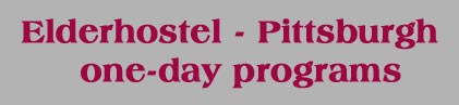 | =========================================== | Sad to say, in 2003 this wonderful program was cancelled and Elderhostel Pittsburgh closed its doors. This page only serves as a reminder of some wonderful one-day Elderhostel trips. Trips that you can recreate yourselves, but without all the extras Elderhostel provided (including wonderful companionship). |