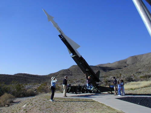 Robert Goddard is called "the father of rocketry". In Roswell, we visited a recreation of Robert Goddard's first laboratory, where he worked on and developed the first American rockets. We saw some of his home movies depicting early rocket launches - both successes and failures.At Almagordo we went to the Space Hall of Fame. There, surrounding the Museum, was a rocket park, which included the Nike Ajax. Larry was delighted to see his old buddy! In the late '50's he had been stationed at White Sands, learning how to shoot off these Ajax missiles. (Later, he was assigned to a Nike site in Needham, MA.) The more years between his days at White Sands and the present, the fonder are his recollections. He sat at the base of his rocket and told all who came near, all about it.
