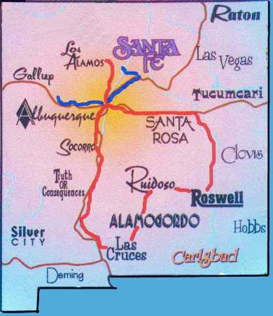 From Atoms to Astronauts: Space and Energy Exploration in New MexicoMarch 2002 - Here was an Elderhostel that would give us an in-depth view of the technical side of New Mexico. Like Larry, most of the hostelers were of a scientific or engineering background, which made for good companionship. Our guides included a retired physicist and a retired history professor. One gave us lectures about the technical sites we would be visiting, the other, the history and geology of the state. We travelled around the state in a 40 seat bus (see map) and stayed at moderate motels. This is what we love about Elderhostel; we are well cared for and don't have to think about these details. We can put our full attention on the subject at hand.