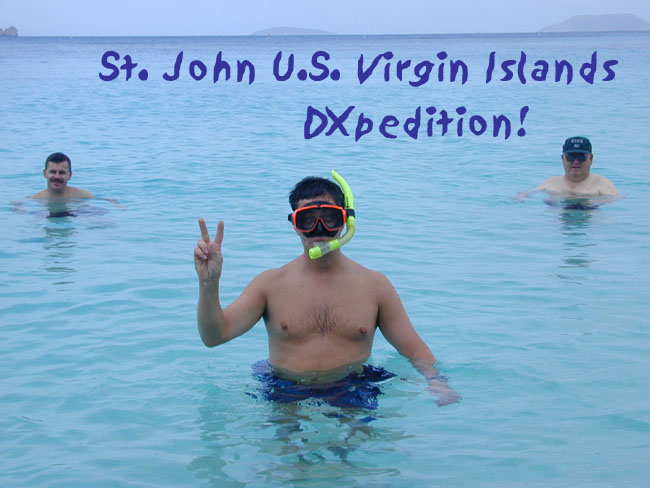 It was an opportunity we couldn't pass up. A former member of the radio club, Paul Jordan, who long ago moved to St. John, U. S. Virgin Islands, offered his condo to club members for free for the week encompassing both the California QSO Party and the PA Party. We'd just have to get ourselves there, provide our on-island rental van, and food. And antennas, transceivers, cables, and networked computers. For months before the trip, Bill W3WH and Larry K3VX worked on designing a vertical antenna for 40 and 15 meters. The antenna was constructed of aluminum elements, which would fit in a KMart molded golf bag for easier transportation. For months Ted W4ZE worked on networking the 4 laptop computers so that the shared logging program would sequentially number the entries from all 4 stations. Steve built a 28.276 mhz beacon for St. John club, which will tell the world when 10 meters is open to St. John. It is a 5 watt beacon, with the call of NP2SH/B. Paul, NP2JF, applied for a vanity call for the Dxpedition, NP2SH. The date for the Dxpedition neared. The two golf bags, filled with antennas, cables, and other radio miscellany, were shipped to the Virgin Islands. So were two other cases crammed with amateur equipment. We felt great relief when Paul reported the arrival of these packages. Paul met us at the St. Thomas airport and brought us to St. John via the auto barge, coming into Cruz Bay. He drove us up the mountain to the doorstep of his beautiful condo, "Plumeria".