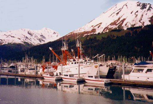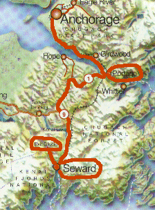 We rented a car at the airport in Achorage and drove to Seward . It was an easy drive and there was plenty of time for stops at the Portage and Exit Glaciers. At Portage there is a junction with the railroad, where those can board who wish to ship themselves and car through the railroad tunnel to Whittier. Further on one approaches the Portage glacier itself, which is hidden from view by a ridge of mountain; there is a small museum there, and boat rides are offered for a close look at the glacier. The glacier museum is small and pleasant and there is a walkway to water's edge. We also saw a display of ice worms in the museum, a subject of great interest since seeing "Smilla's Sense of Snow", a movie whose plot turns on the existance of ice worms. Along the access road to the glacier there are a number of small parks. We pulled off into one to eat our lunch (sandwiches and fruit we'd picked up at a supermarket in Anchorage before setting out) and enjoy a spectacular view of Mountain and lakelet with beaver dam and ducks.