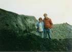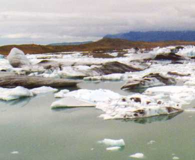 Vatnajokull, on the southeastern slopes of Iceland, is the largest glacier in Europe. Our tour took us around the glacier; we camped at its foot and walked close enough to touch it; we traveled to the high desert, and camped just behind its head. That was a stark and desolate campsite: sod "rugs" had been brought in to pitch our tents on, otherwise the ground would have been too uncomfortable for sleeping. There was a very small airstrip there, we strolled up to it and looked back, up to the peaks looming above us. Someone pointed to the snow cap, with steam rising from it. "Bet that's where we will hike tomorrow". The rest of us were incredulous, unbelieving. It seemed almost -- out of sight! But in the morning, after eating a hearty breakfast and tearing down the tents, Sigrun gathered us all together. "Are you ready for a little walk?" she asked. Several of us suggested we'd wait back here, and were told that was impossible, we'd be meeting the bus on the other side. And so we trekked up the mountain, Tippi bringing up the rear. Her boots were the products of Banana Republic; darling boots but not at all waterproof. Her feet were wet and cold, she was wet and cold and miserable. "Never again" she was heard to mutter. We hiked passed the steam vents, reminders that this glacier was sitting on top of a live volcano, to the top of the glacier where a hut had been built. It was a resting spot. The others had finished their rest when Tippi and Larry finally arrived. Again we brought up the rear. The rest of the tour group were always out of sight, but we had their tracks to follow. At the bottom of the snow field, luckily, some friends had waited to guide us to the bus.